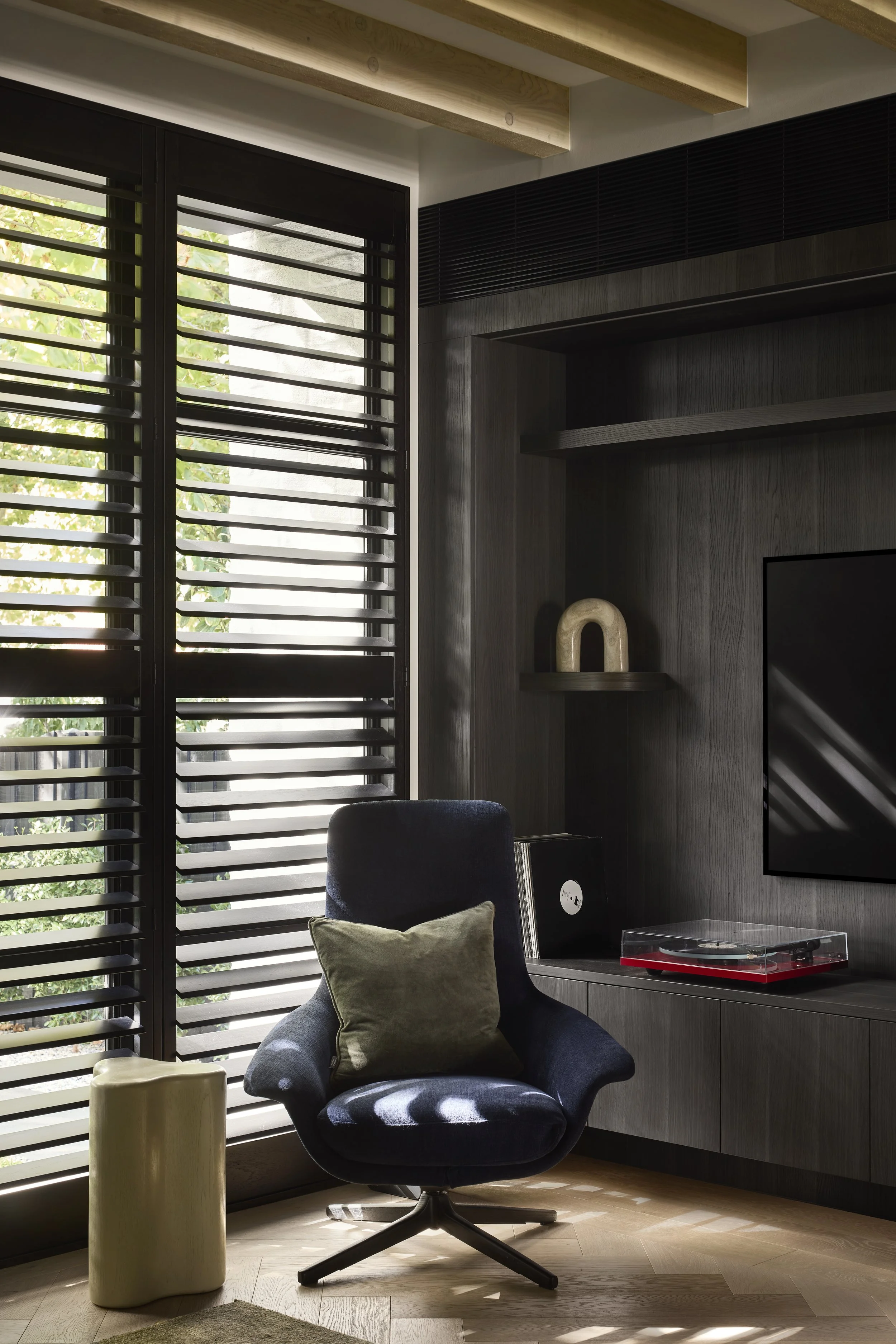 Designed with architectural precision, Goldsmith House masterfully manipulates space to evoke a sense of grandeur. Strategic planning and sculpted forms create the illusion of expansive grounds, while soaring internal heights are accentuated by exposed floor joists and an elevated ceiling. A sunken lounge introduces depth, while integrated banquette seating expands the perceived width of the narrow site. A raked garden seamlessly extends over concealed parking, leading to a sun-drenched rear studio terrace that visually elongates the property, blurring the boundaries between built form and landscape.