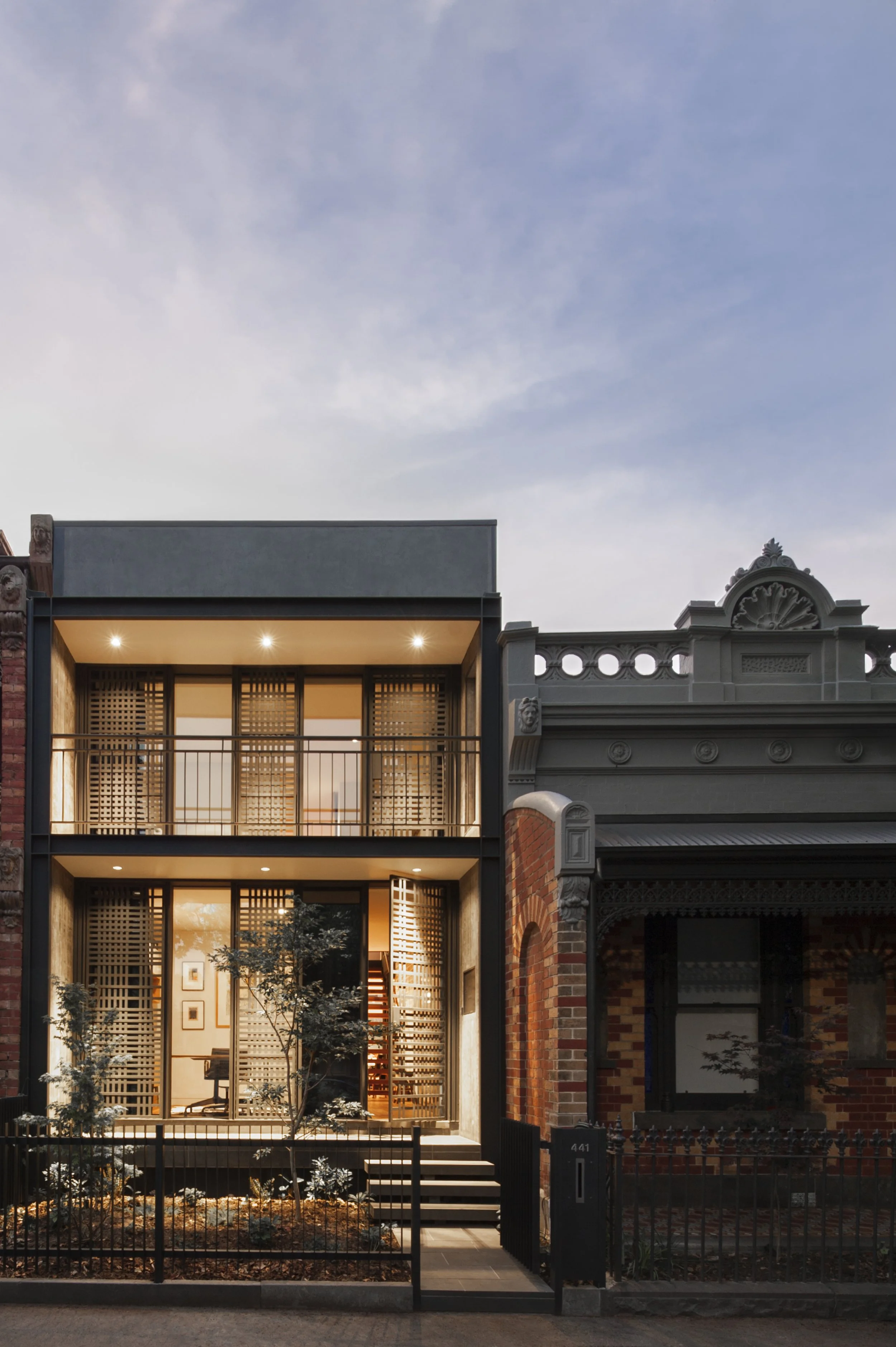 The façade respects the rhythm of Fitzroys iconic townhouse streetscape with finely woven steel strap screens, painted brickwork, and muted tones that sit comfortably within the exisiting context. Internally, the plan pivots around a central light court and extends upward, creating light-filled, flexible spaces that balance family life with work from home ability.
